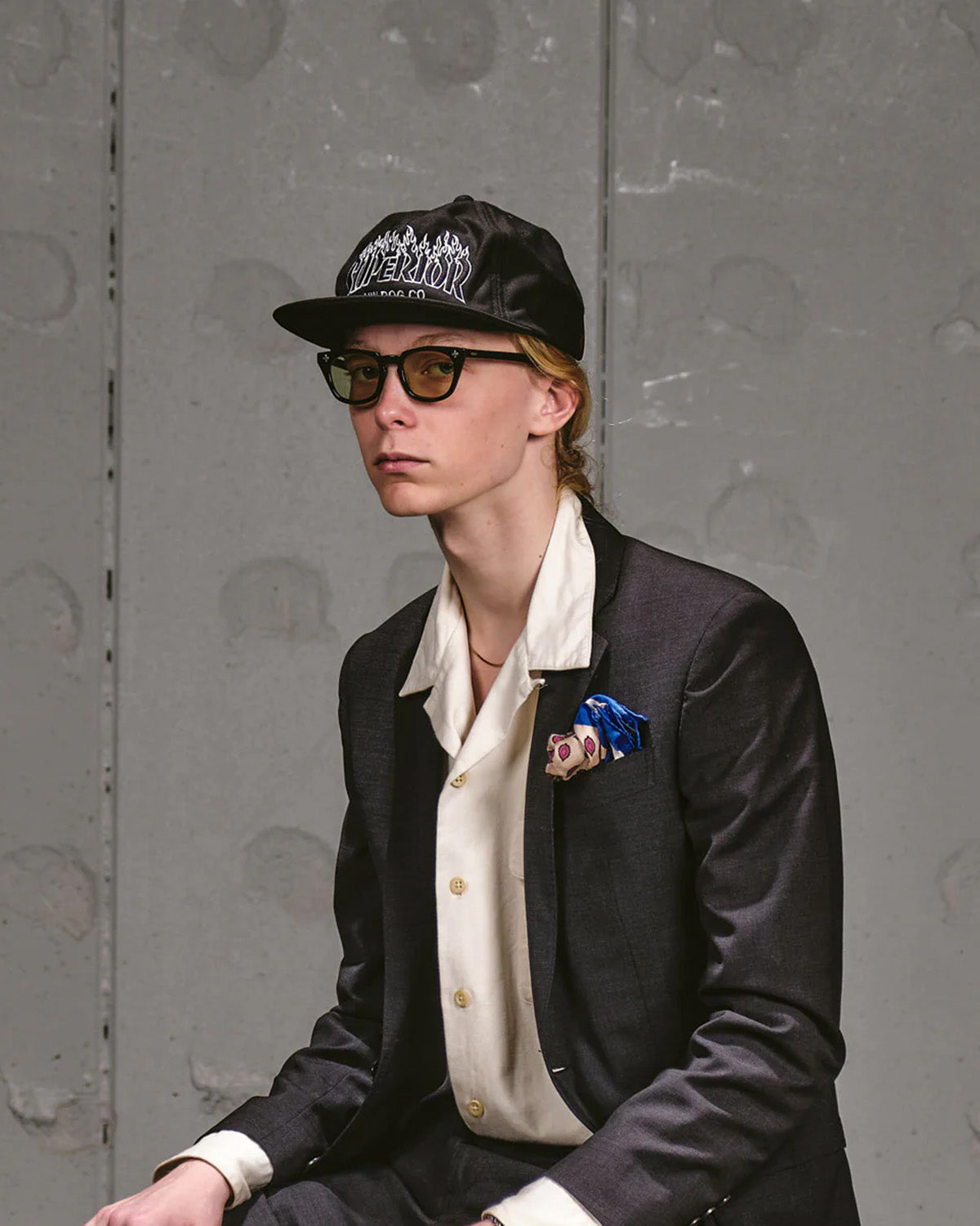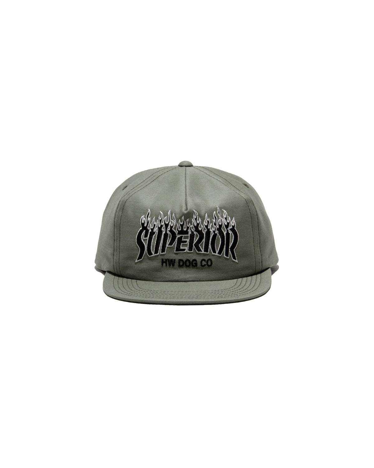The design has a trendy feel with details that could be found in the 90s with “SUPERIOR HWDOGCO” arranged in fire-pattern embroidery.