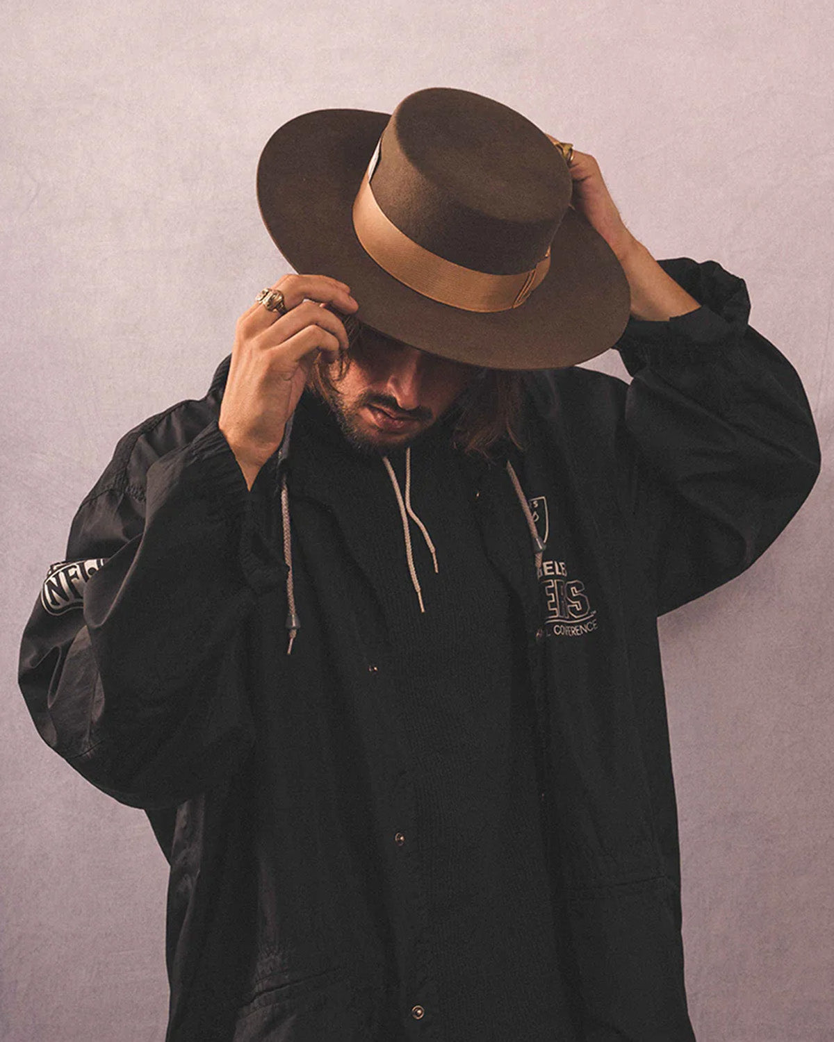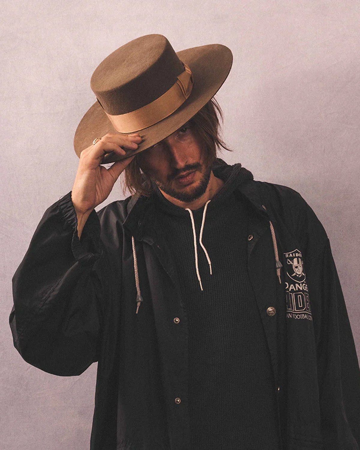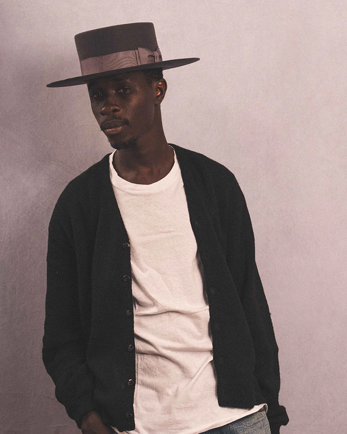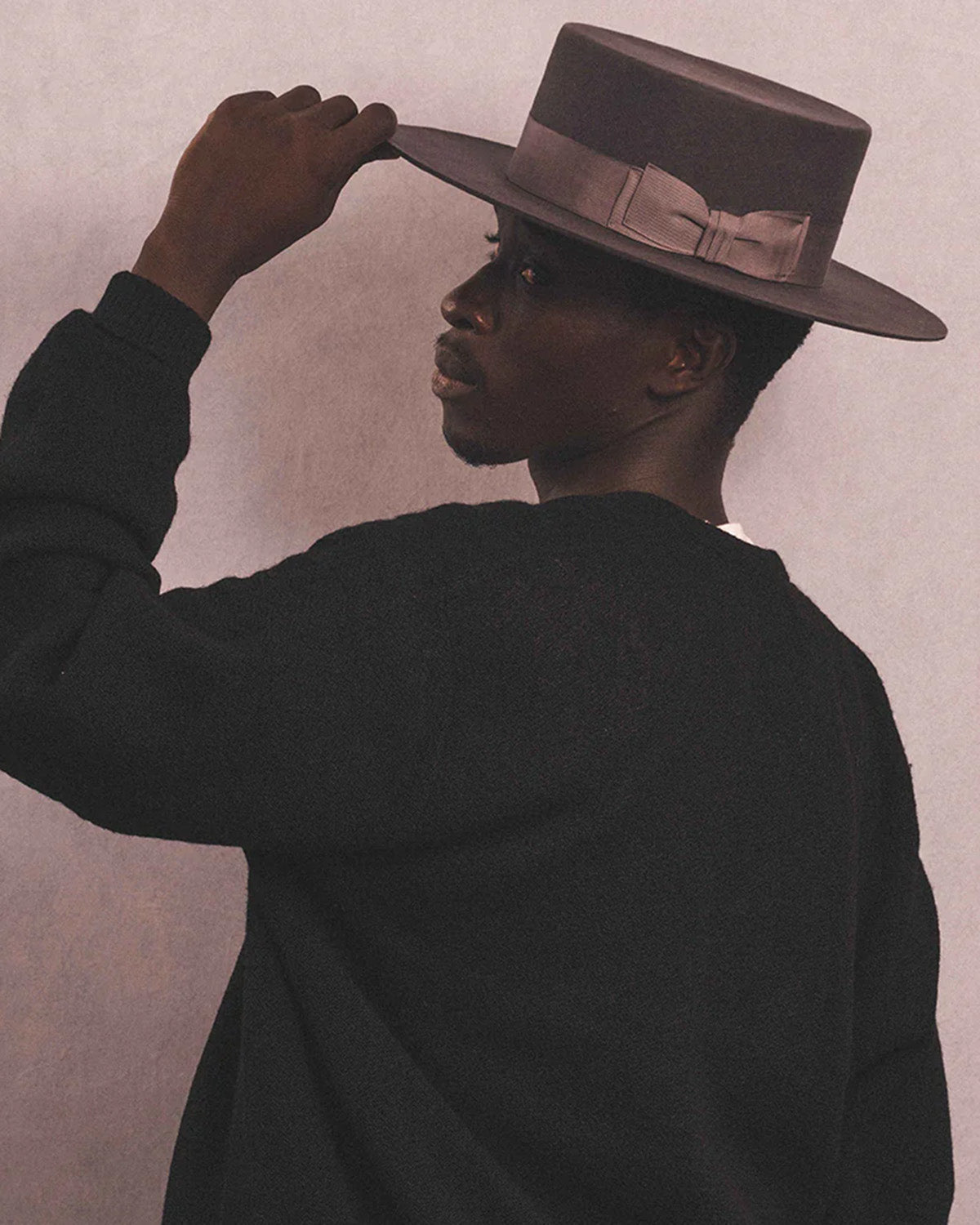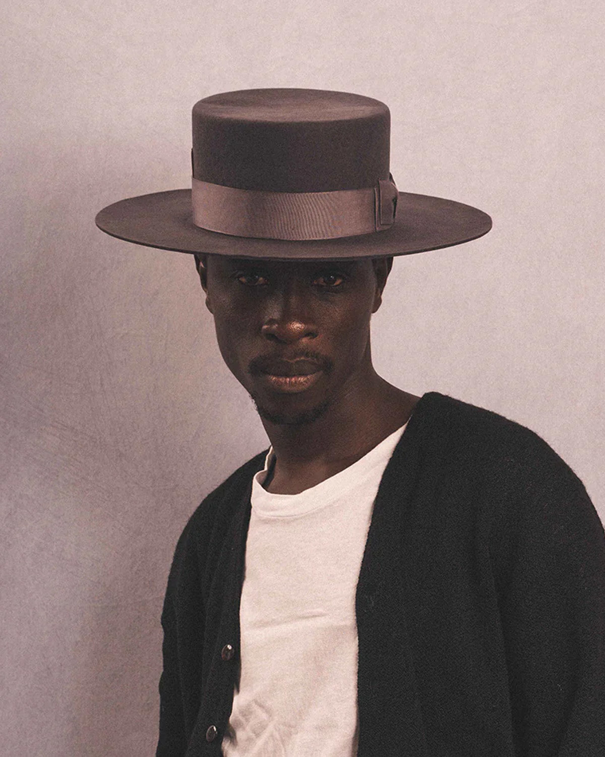 Long brimmed boater hat in 100% wool.