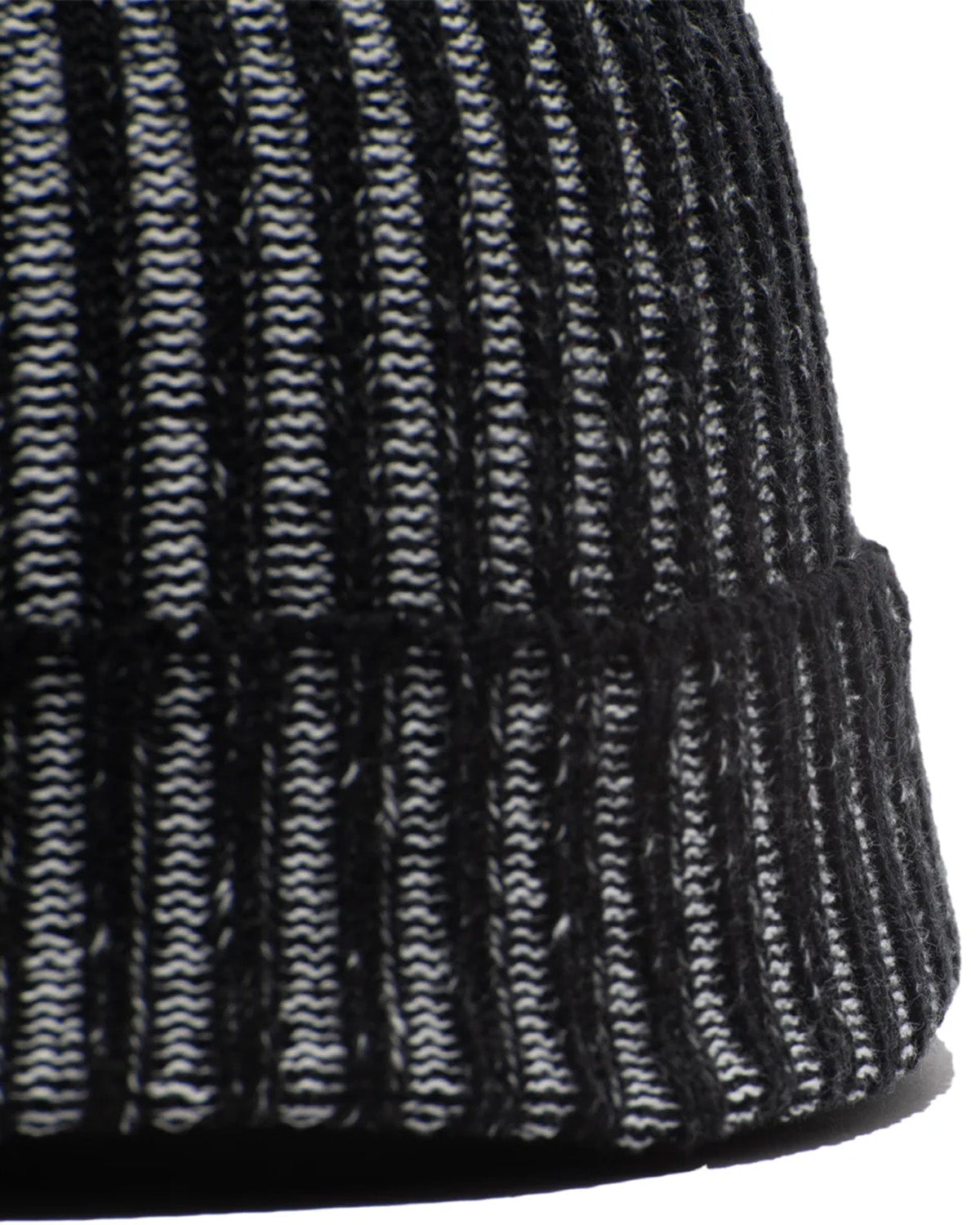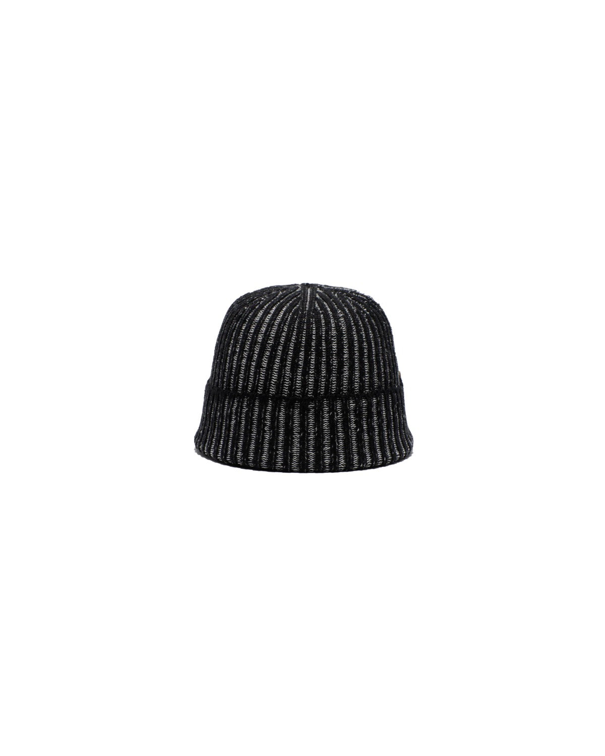 This is a unique knit hat that is highly stretchy and when worn the ribs open, revealing the different colored yarn inside.
