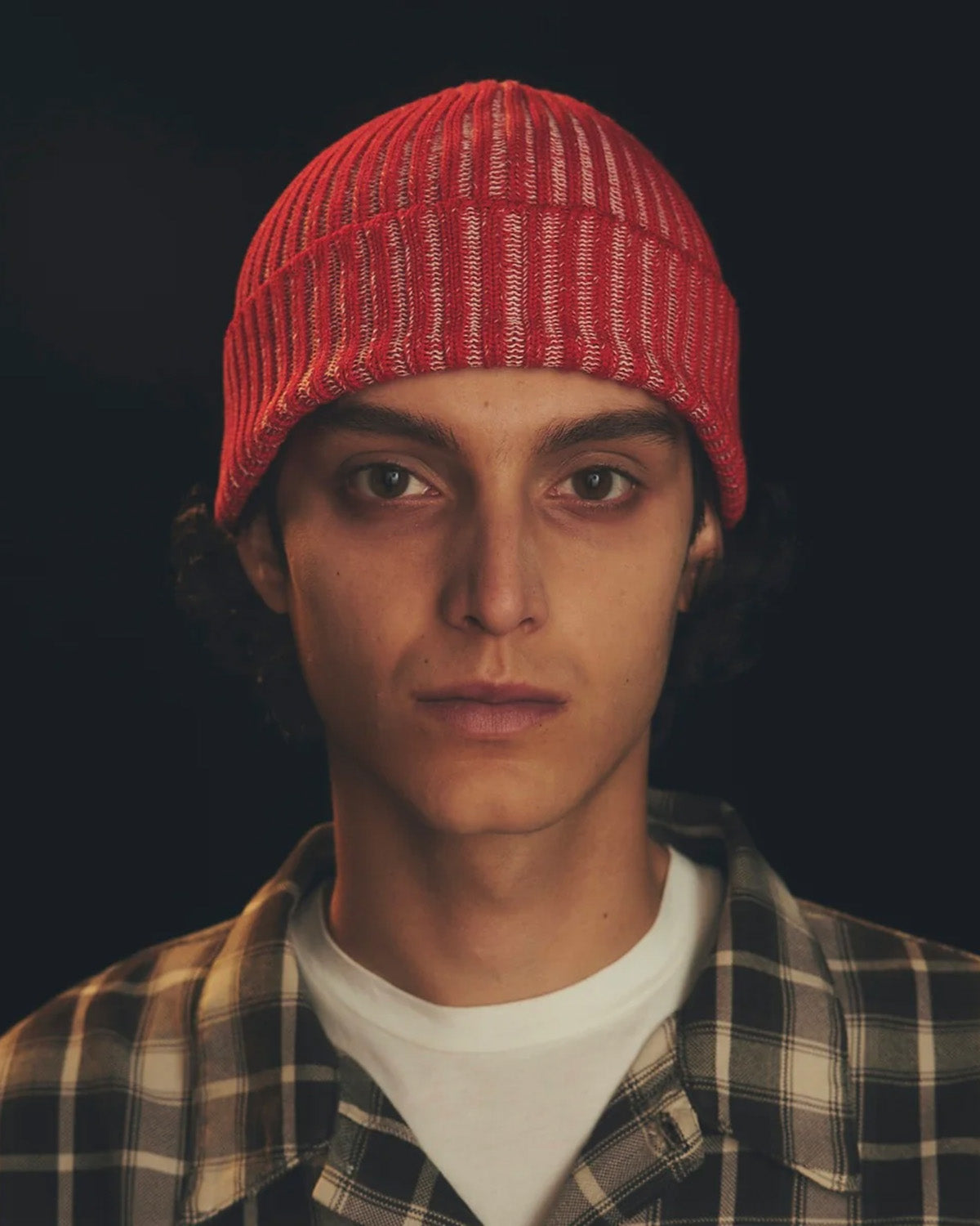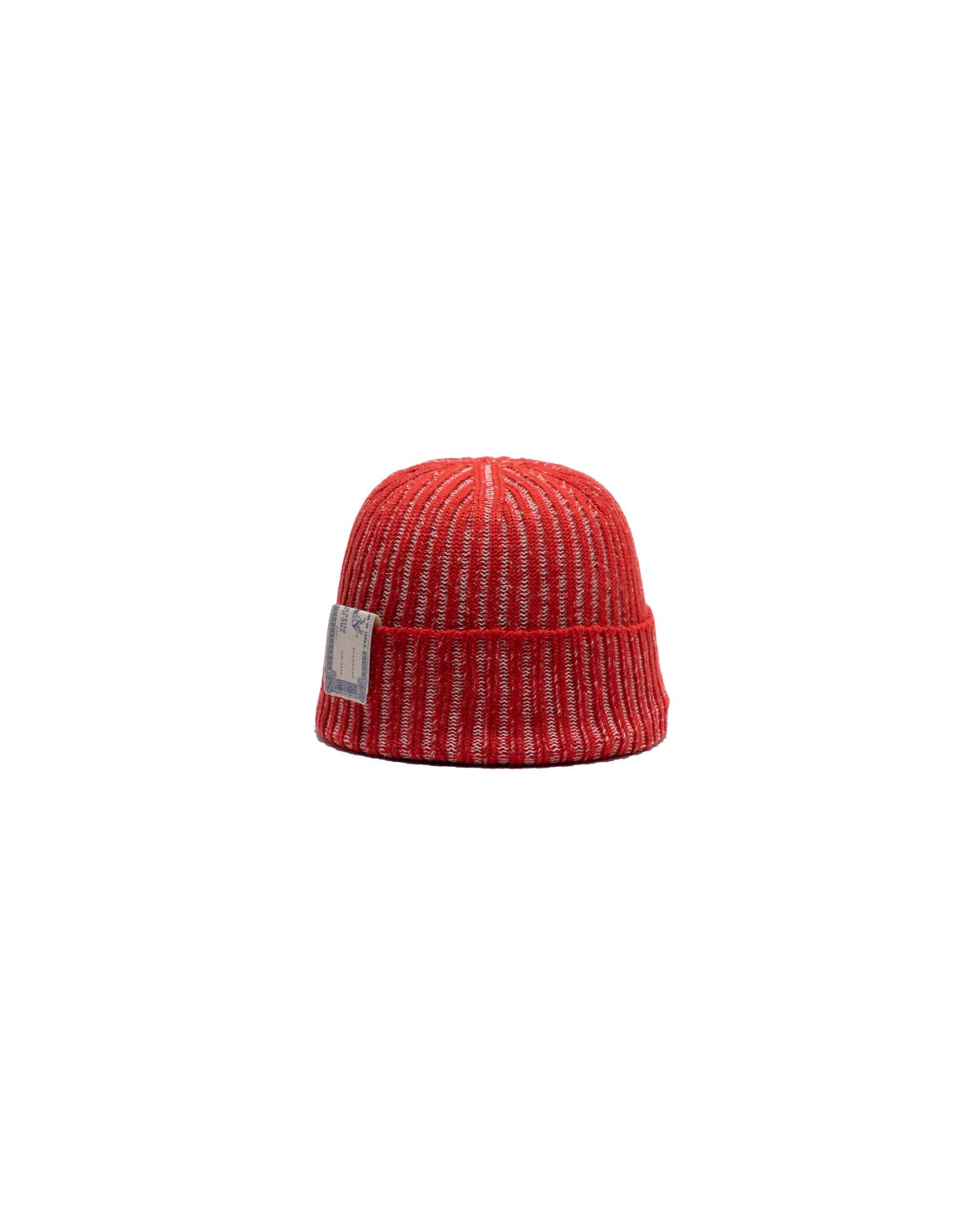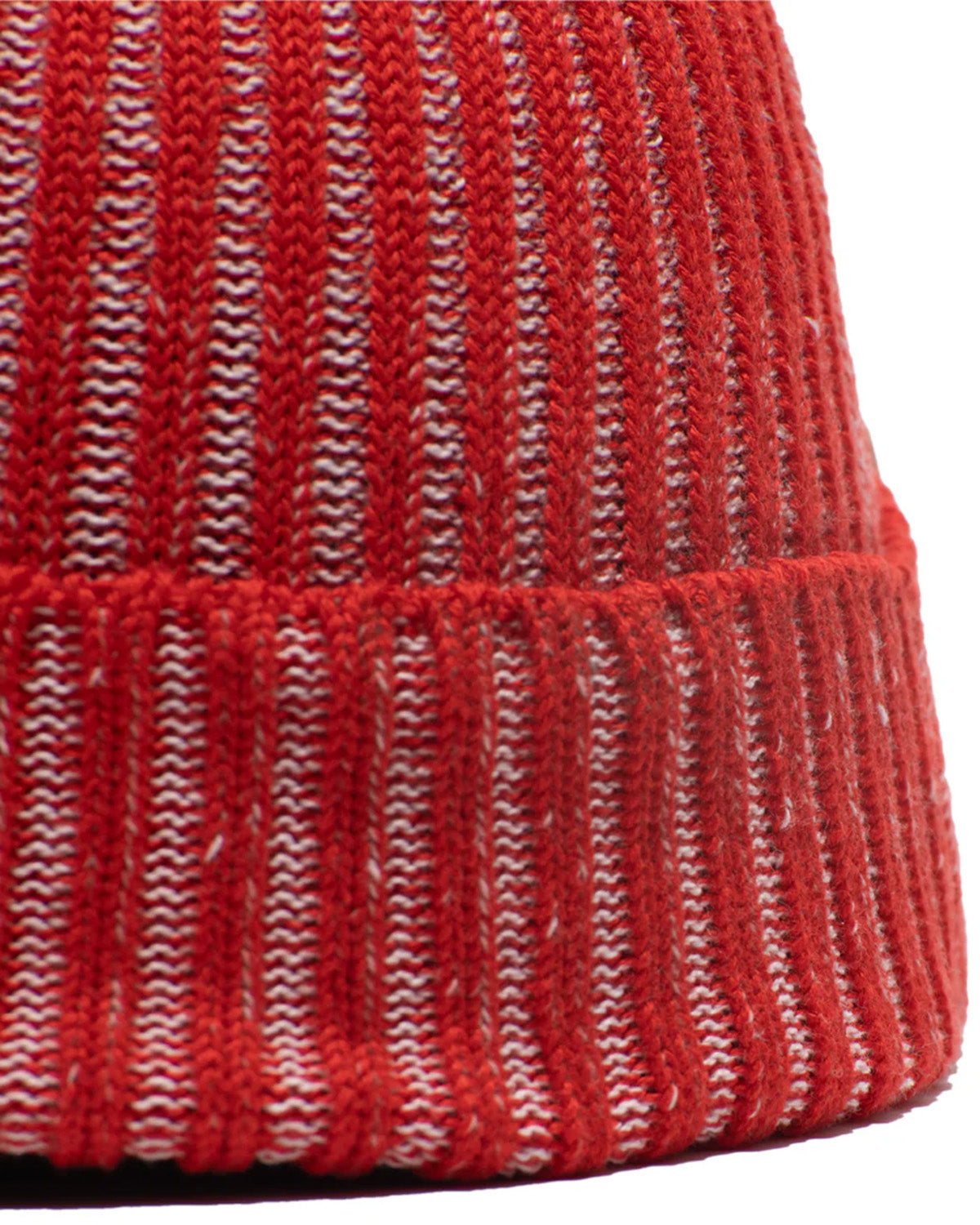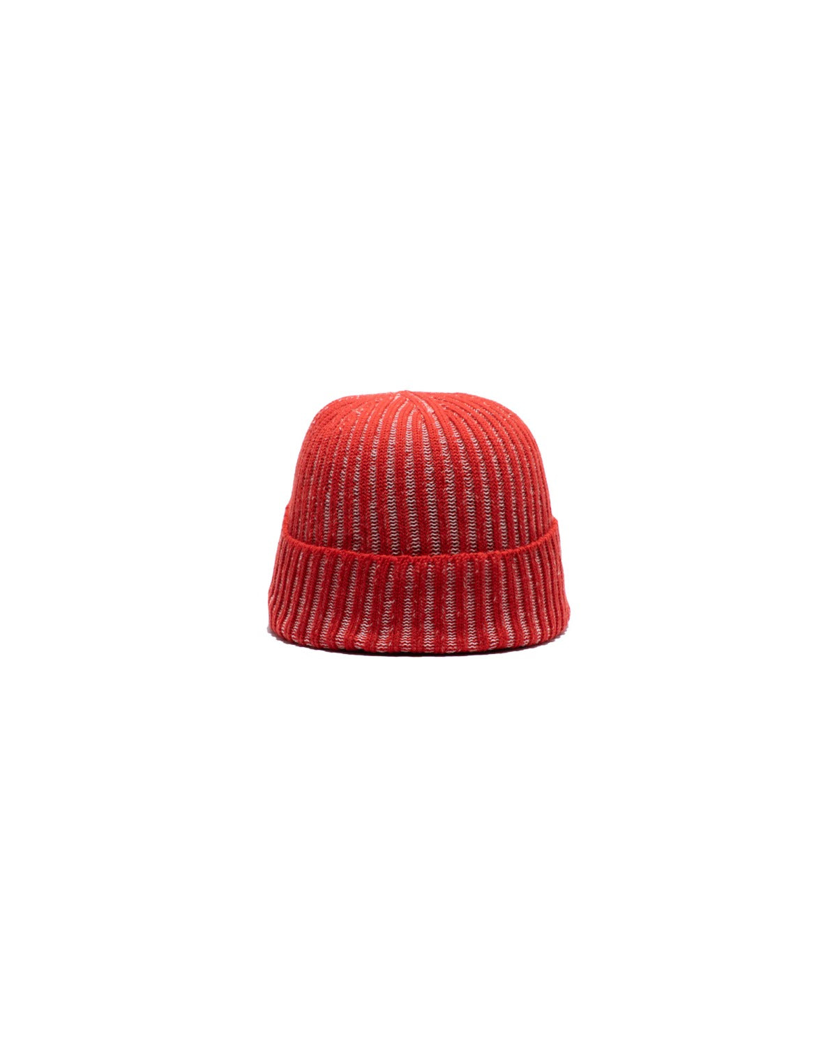 This is a unique knit hat that is highly stretchy and when worn the ribs open, revealing the different colored yarn inside.