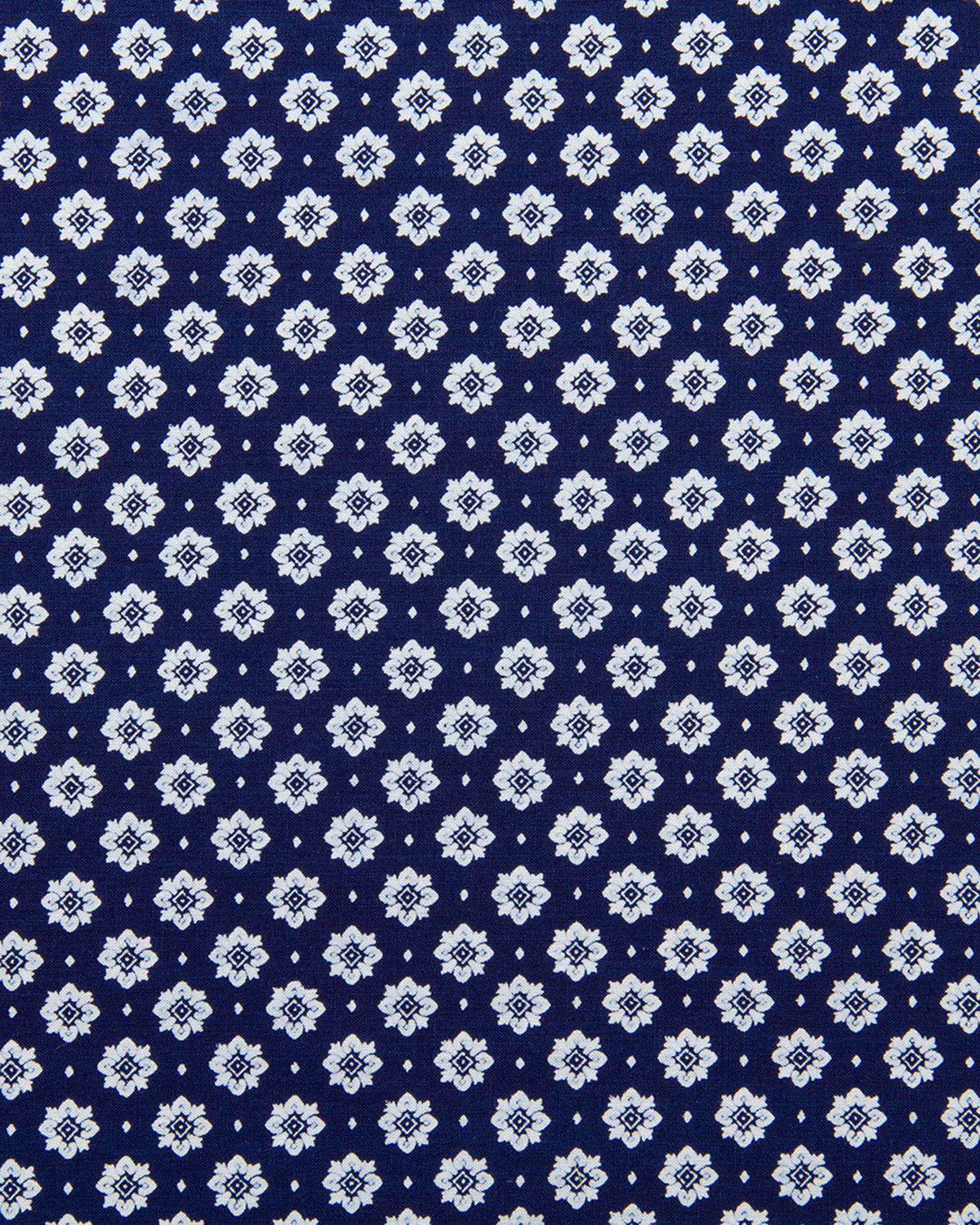 This is an original design made by dyeing 100% bleached cotton bandana fabric with indigo and then discharging the pattern.