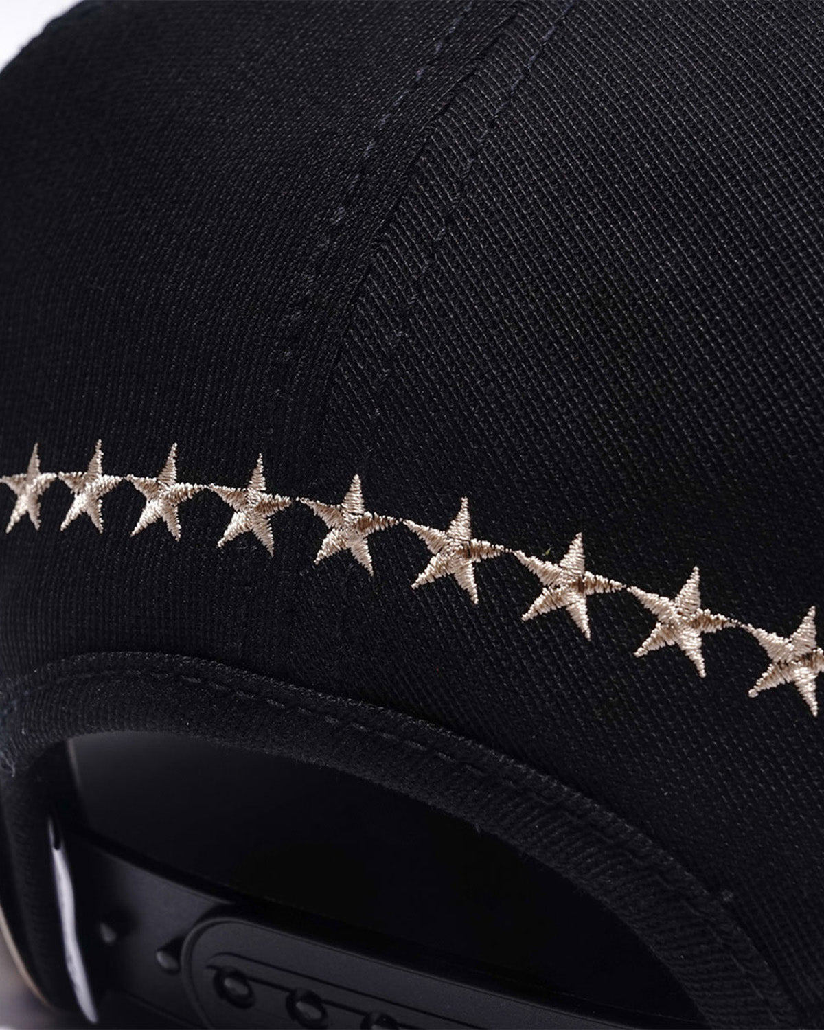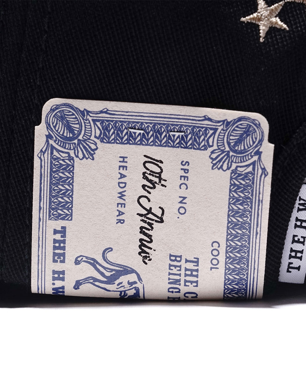 Featuring the same printed logo as the D-00004 TRUCKER CAP, but with an embroidered mouthpiece for enhanced sophistication. The back panel bears the 10STAR '★★★★★★★★★★' embroidery signifying the 10th anniversary.