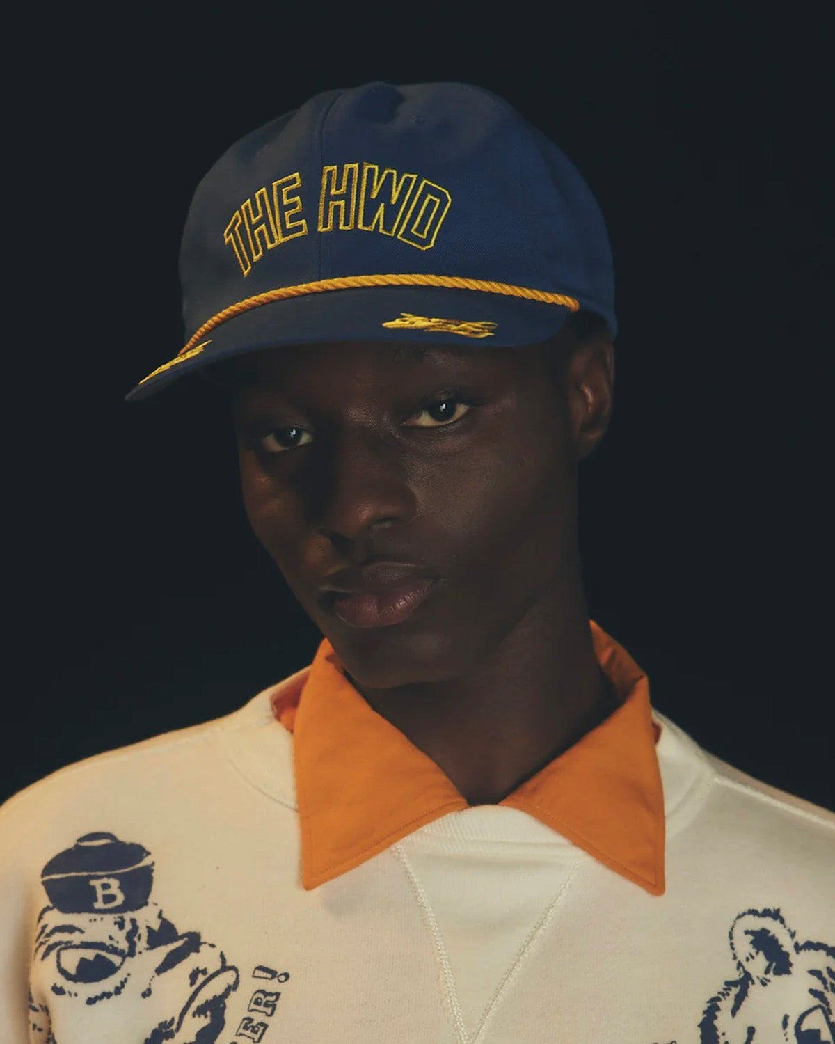 It is designed with “THE HWD” frame embroidery on the front panel and a dog motif fire pattern embroidery on the brim.