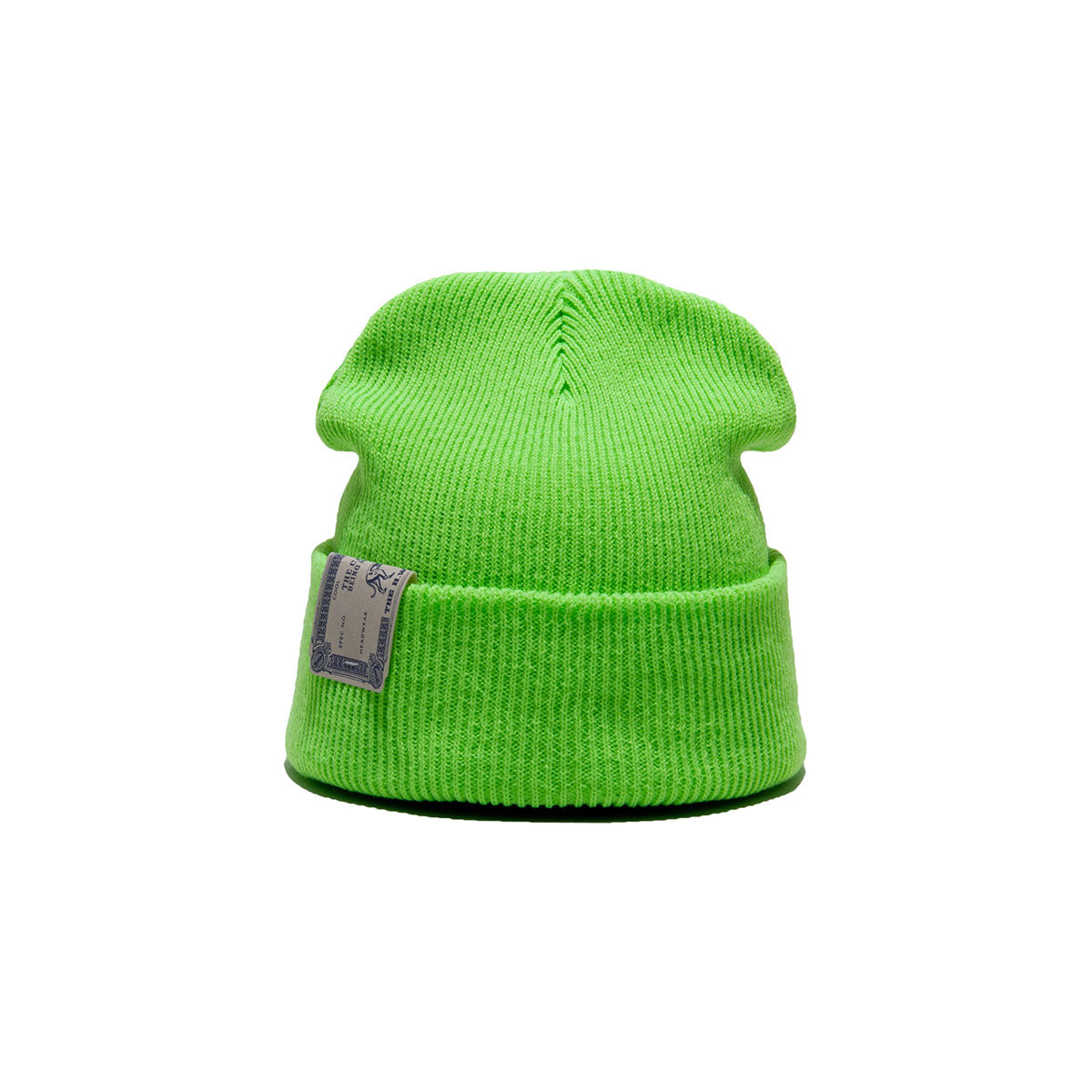 大ぶりのニットキャップにアクリル糸を使うことでキックバックの強度を持たせ、光沢感と発色の良い色展開になっています。