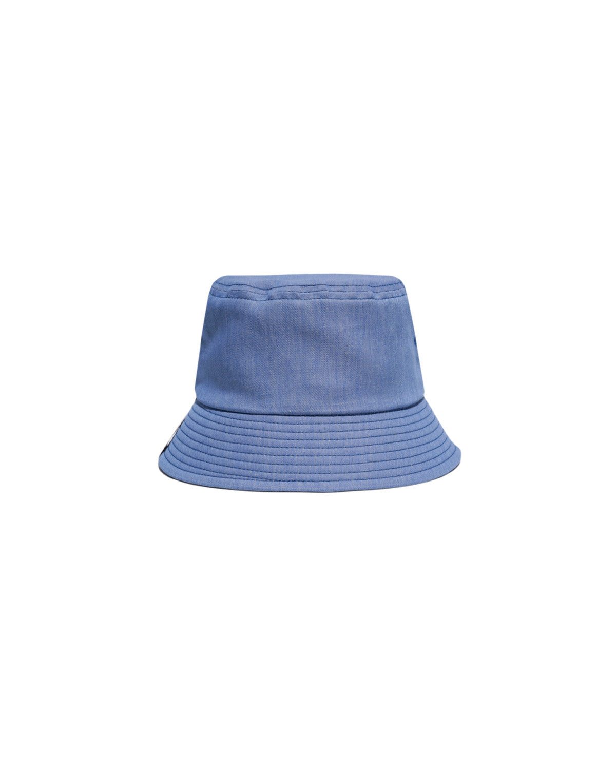 A bucket hat crafted from lightweight cotton-linen chambray fabric.